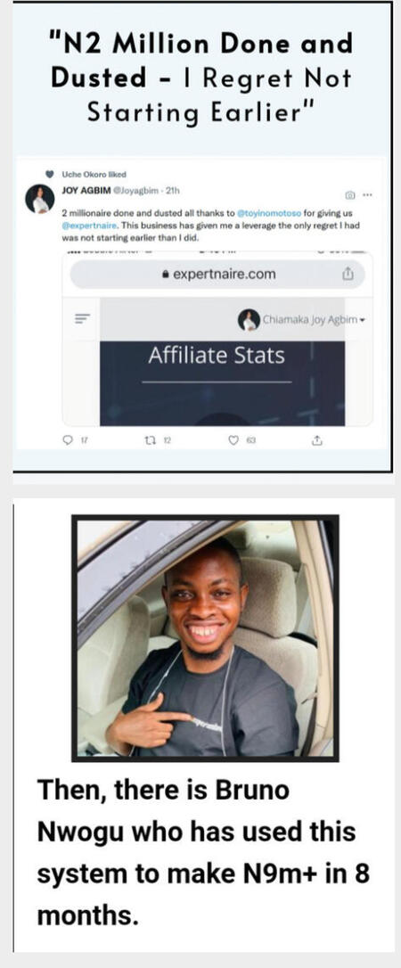 Complete newbies are legally making as much as N300k a month using their smart phones plus a new & simple money-making technique called the: AFFILIATE BILLIONAIRES COURSEWHAT IS EXPERTNAIRE?